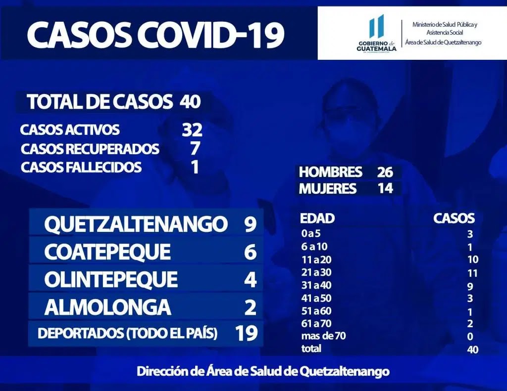 El Área de Salud confirmó 40 casos de coronavirus covid-19 en el departamento de Quetaltenango de los cuales están activos 32, siete recuperados y lamentablemente una persona ha fallecidos.